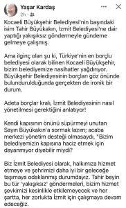 İzmit Belediye Başkan Yardımcısı Yaşar Kardaş, Kocaeli Büyükşehir Belediye Başkanı Tahir Büyükakın’ın haciz açıklamalarına cevap vererek, “Borçlar kralının nasihat vermesi ironik!” ifadelerini kullandı