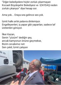“Neden Büyükşehir Belediyesi söz verdiği ve yasa gereği mecbur olduğu halde aktarma istasyonu göstermiyor” diye hesap sor. “Diğer belediyelere hiçbir zorluk çıkarmayan Kocaeli Büyükşehir Belediyesi ve İZAYDAŞ neden zorluk çıkarıyor” diye hesap sor. Ama yok… Oraya sıra gelince ses yok. İzmit halkı artık palavra dinlemiyor. Engelleyenleri, iş yapar gibi yapanları, sadece laf üretenleri Görüyor. İlker Kazan, Senin “çözüm” dediğin şey, ancak kamyonun önüne geçmekse Bizim cevabımız net: Sen çekil, İzmit çalışsın”