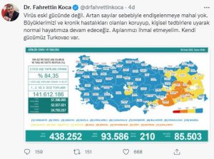 Vaka sayılarıyla ilgili açıklama yapan Bakan Koca mesajında; “Virüs eski gücünde değil. Artan sayılar sebebiyle endişelenmeye mahal yok. Büyüklerimizi ve kronik hastalıkları olanları koruyup, kişisel tedbirlere uyarak normal hayatımıza devam edeceğiz. Aşılarımızı ihmal etmeyelim. Kendi gücümüz Turkovac var.” ifadelerini kullandı.