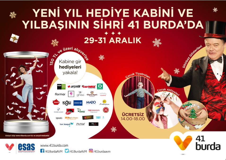 Esas Gayrimenkul tarafından hayata geçirilen 41 Burda AVM, yeni yılda da Kocaelililere alışverişin tadını doyasıya yaşatıyor. Açıldığı günden itibaren Kocaeli’yi eğlence, yaşam ve buluşma merkezi haline getiren 41 Burda AVM, ziyaretçilerini birbirinden renkli hediyeler ve etkinliklerle yeni yılın heyecanını birlikte yaşamaya davet ediyor.