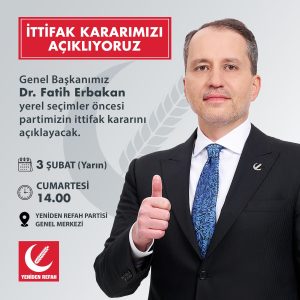 Yeniden Refah Partisi Lideri Fatih Erbakan, 3 Şubat Cumartesi günü saat 14:00’de ittifak kararını açıklayacak. İstanbul ve Ankara’da seçimlerin kaderini etkileyecek karar verildi ve artık gözler Erbakan’da.