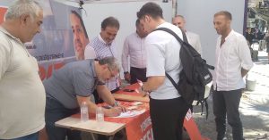 Çayırova’da partisinin üye standına katılan İl Başkanı Ahmet Emre Aydın ve Kocaeli Milletvekili Mehmet Aşıla partiye yeni katılan üyelerin beyannamelerini imzaladılar. Başkan Aydın ve Aşıla yeni katılımlarla moral buldular.