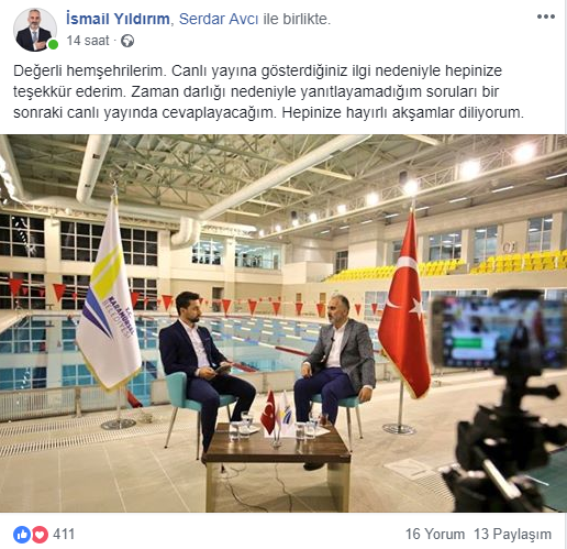 Karamürsel’de yakın zamanda açılışı gerçekleştirilecek olan Karamürsel Yüzme Havuzunda gerçekleşen canlı yayın saat 20.00’de başladı. ‘İsmail Yıldırım canlı yayında’ paylaşımı ile yayına giren İsmail Yıldırım’ın şahsi sosyal medya hesabı kısa süre içerisinde geniş kitleye ulaştı. 100 dakika süren yayında Başkan Yıldırım binin üzerinde emoji, 635 yorum alırken 221 kişi yayını paylaştı. ‘Huzurun Başkenti’ Karamürsel’in mimarı Başkan Yıldırım’ın canlı yayınını 12 bin kişi izledi.