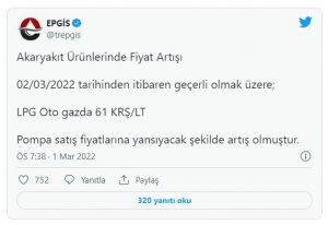 Akaryakıt ürünlerinde fiyat artışı. 02/03/2022 tarihinden itibaren geçerli olmak üzere; LPG Oto gazda 61 KRŞ/LT pompa satış fiyatlarına yansıyacak şekilde artış olmuştur.